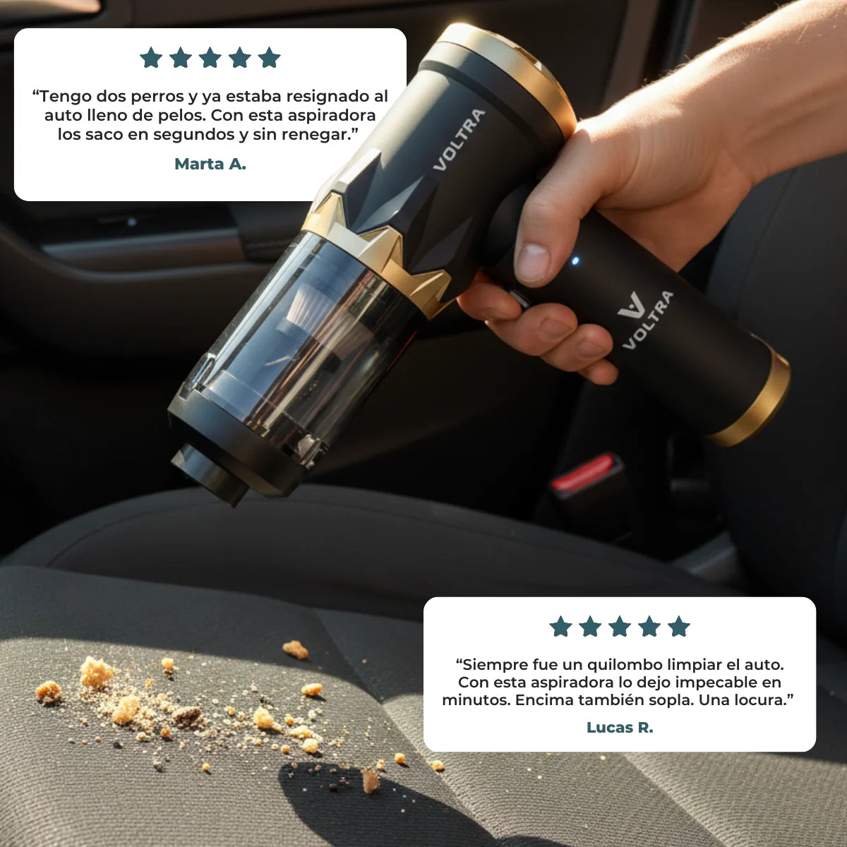 La Voltra® 3 en 1 es una aspiradora portátil premium pensada para quienes quieren limpiar el auto, la casa o la oficina sin cables y con potencia real. Compacta, liviana y con terminaciones de calidad, llega a ranuras, esquinas y tapizados donde lo común no llega.